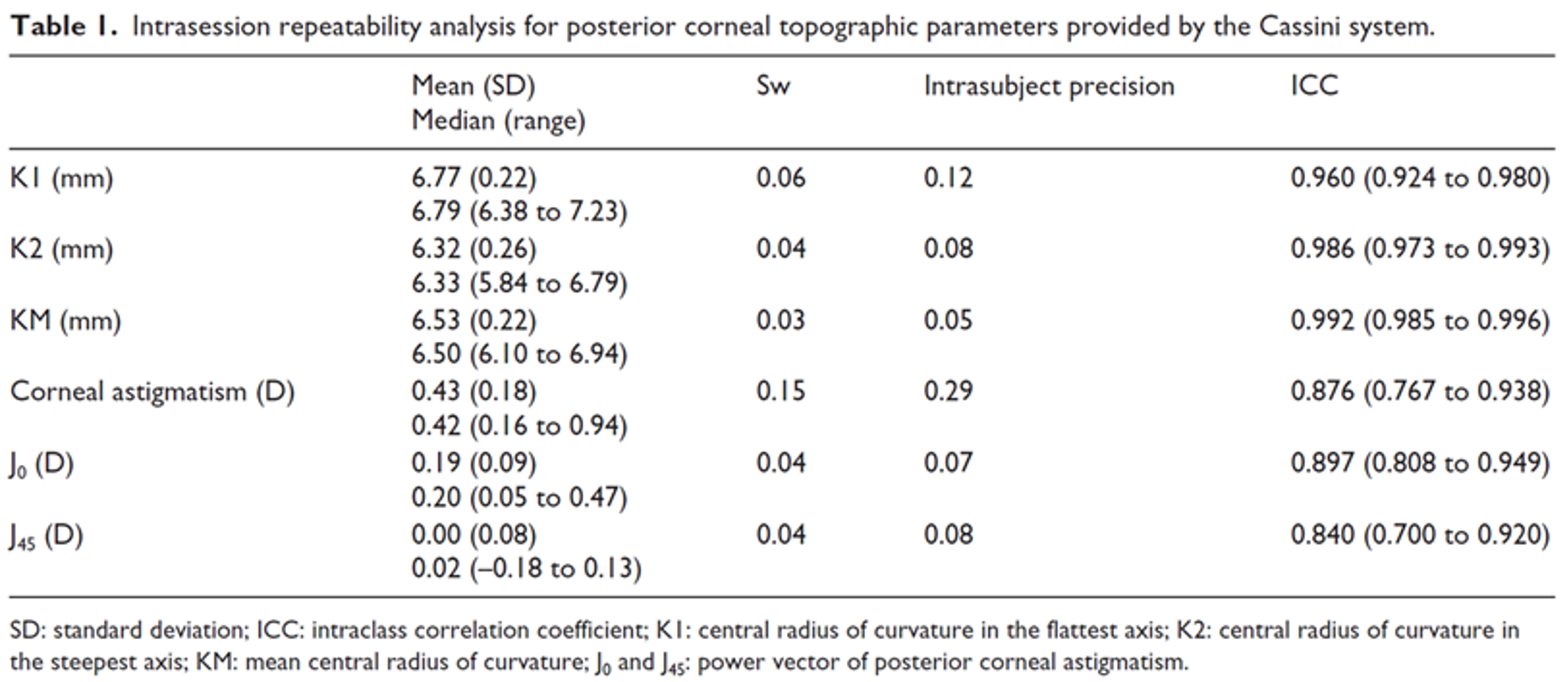 Cassini demonstrated intrasession repeatability wCassini demonstrated intrasession repeatability with Sw ≤ 0.06 mm and ICC ≥ 0.960, indicating excellent reliability in posterior corneal curvature measurementsith Sw ≤ 0.06 mm and ICC ≥ 0.960, indicating excellent reliability in posterior corneal curvature measurements.