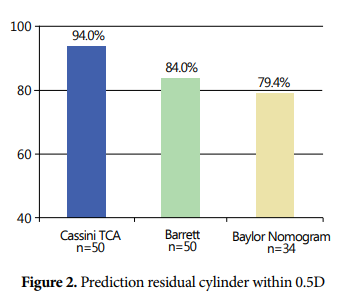 Cassini TCA provided the most accurate prediction of postoperative refractive astigmatism, and permitted superior astigmatic correction, achieving 94% of eyes within 0.50 D residual manifest refractive cylinder.