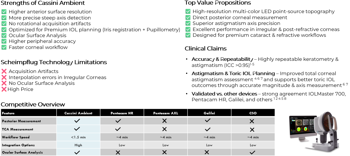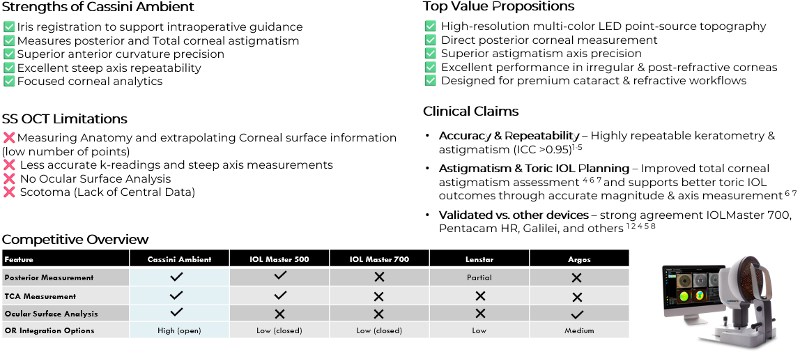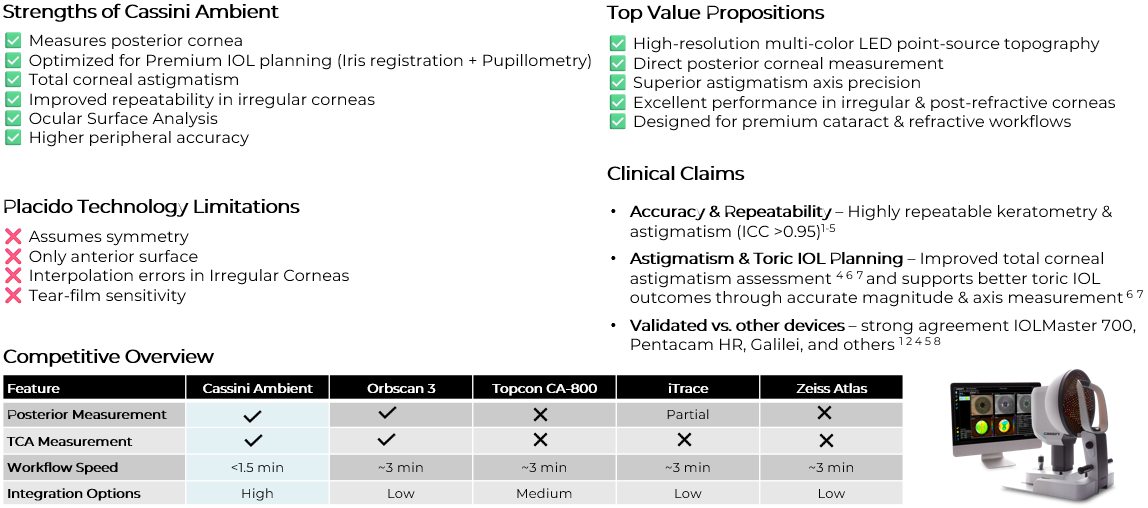 Compare Cassini Ambient, the core diagnostic component of Cassini Connect OR, with competitors’ diagnostic technologies. Focus on both technology differences and integration, and tailor your pitch based on each surgeon’s technology priorities.