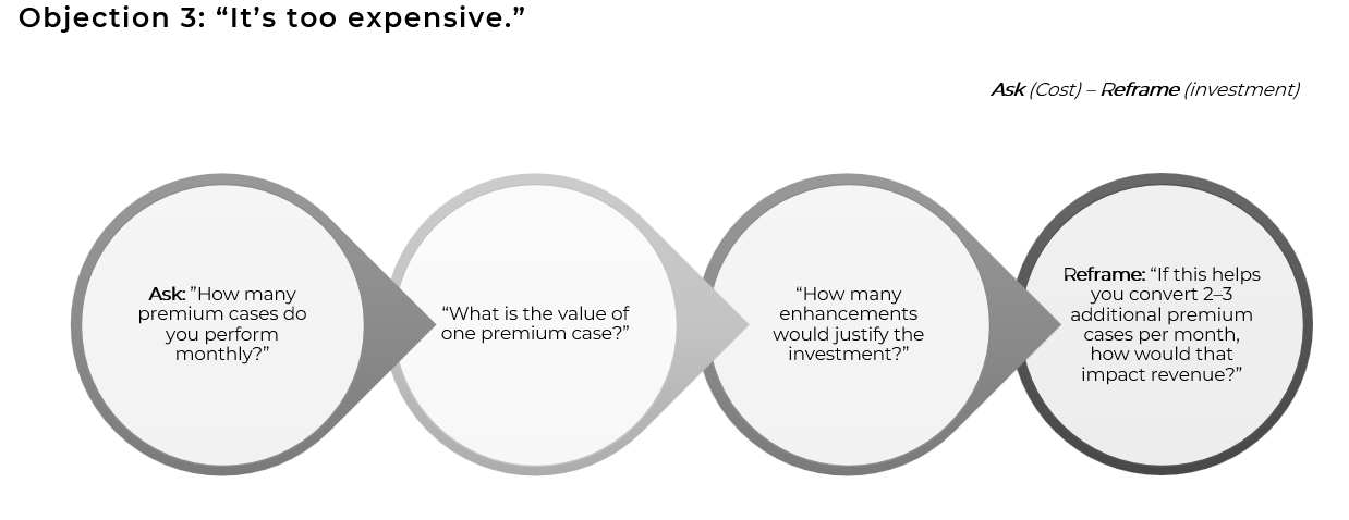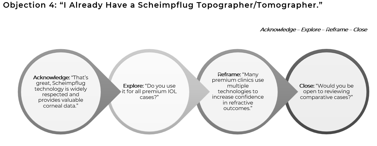 Navigate common objections using a structured approach–acknowledge the customers perspective, explore with open-ended questions, differentiate based on their feedback, and close with confidence.
